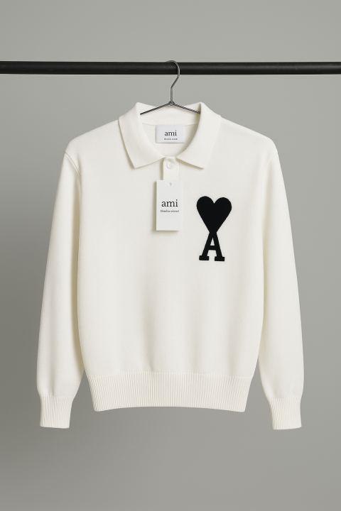 Home T-Shirts Ami Paris White Knitted Polo Full sleeves IMPORTED
