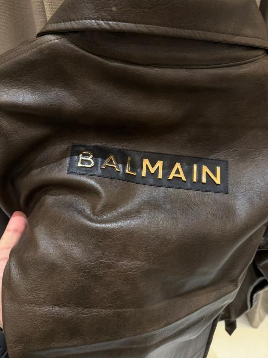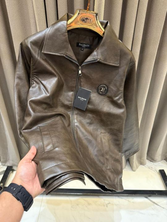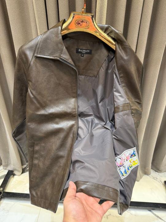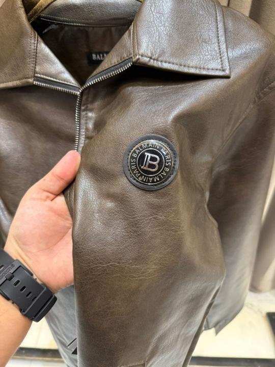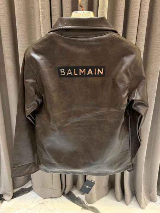 Balmai_n Metal Chest Logo Leather Jacket Brown