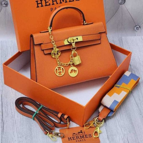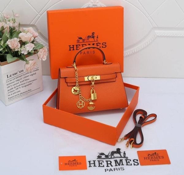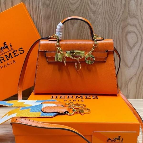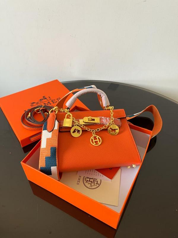 Home Hand bags Herms Kelly Mini Epsom Leather Orange With Charms 2 Belts OG Box Dust Bag Cards And CarryBag 1009