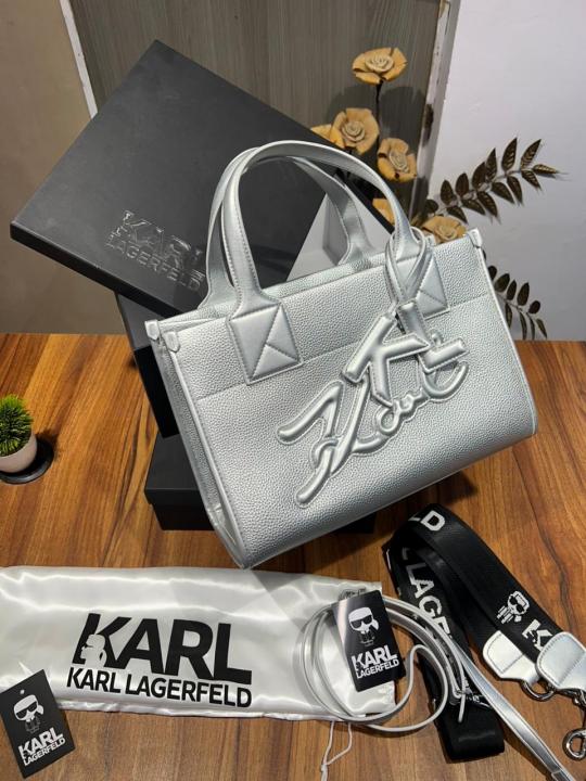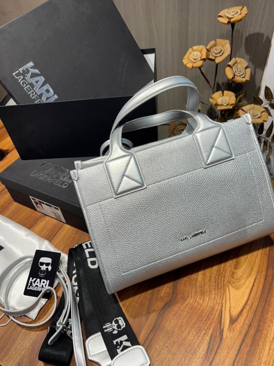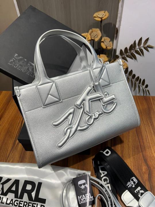 Karl Lagerfeld KSKUARE SILVER Color Grainy Small Tote Bag (With Box)