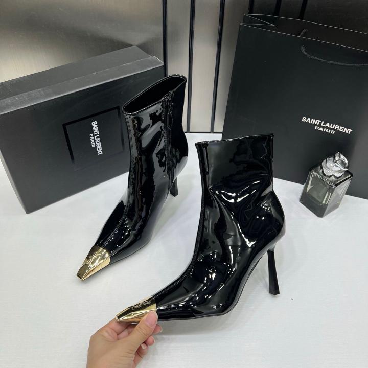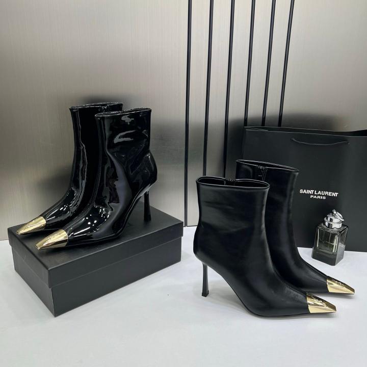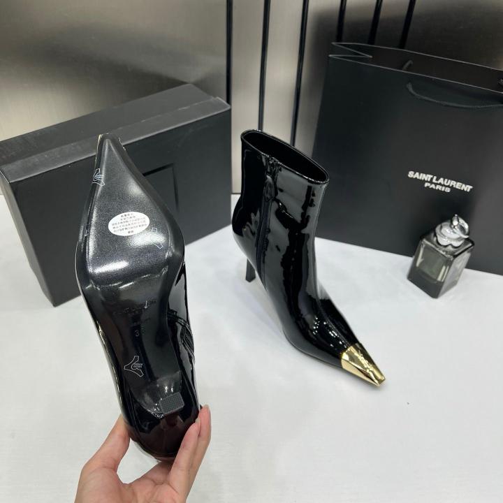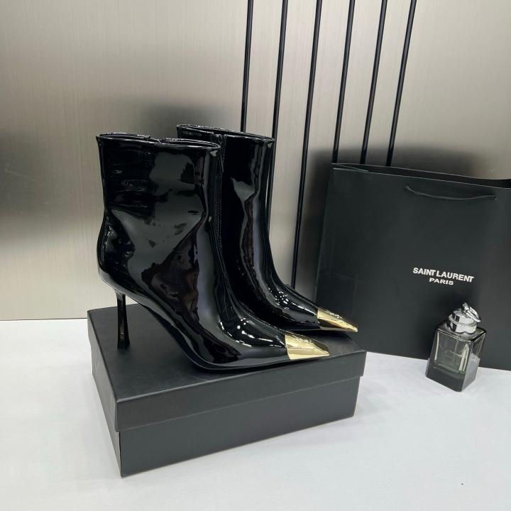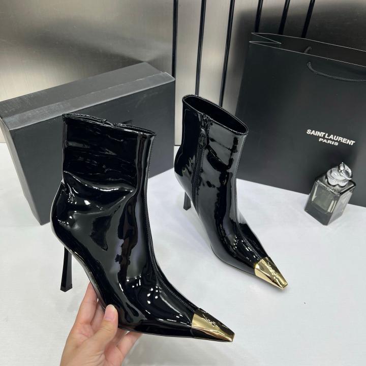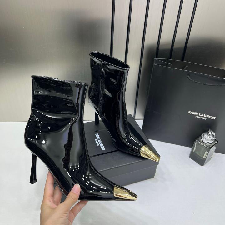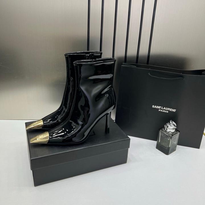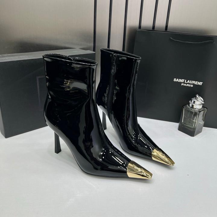 Ysl_Saint_Laurent_Paris_Black_Glossy_High-Heeled_Ankle_Boots_With_Gold_Metal_Toe_Cap_With_OG_Box_Dust_Cover_&_Carry_Bag_B1_Black_Glossy
